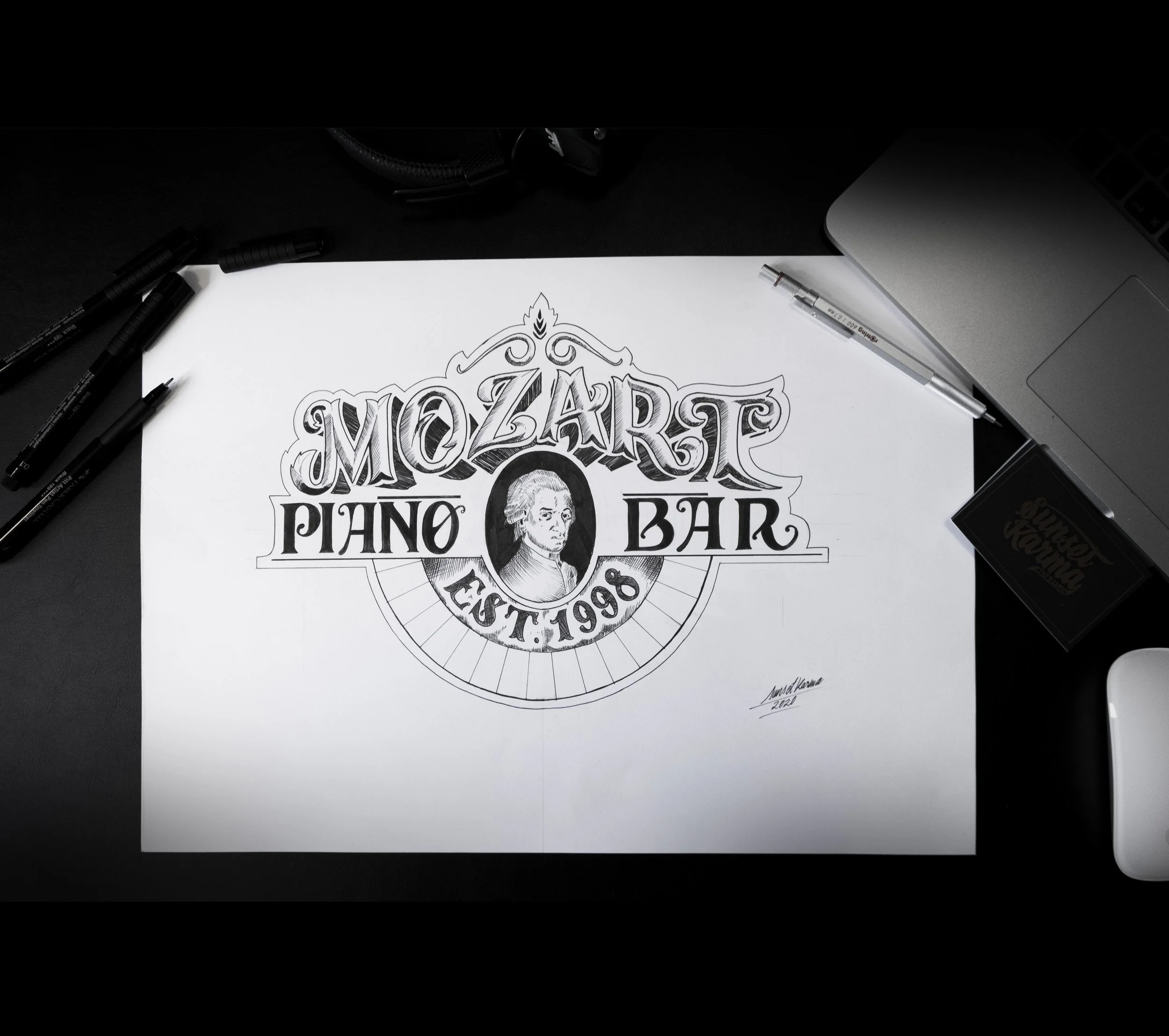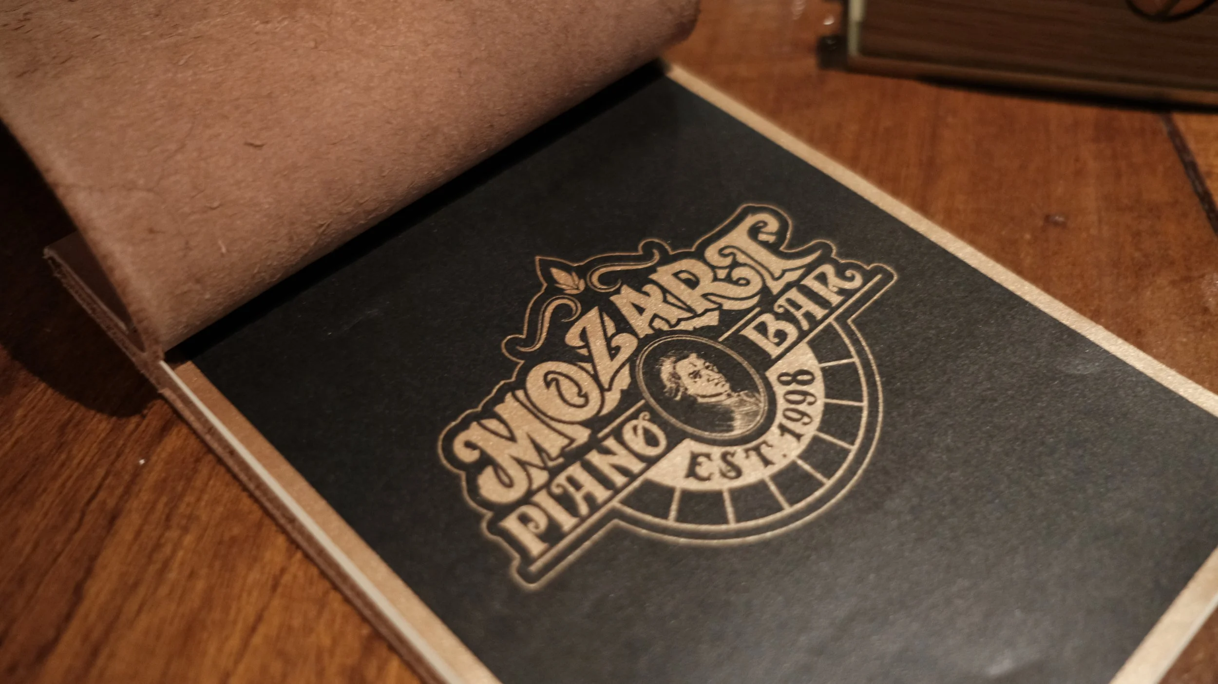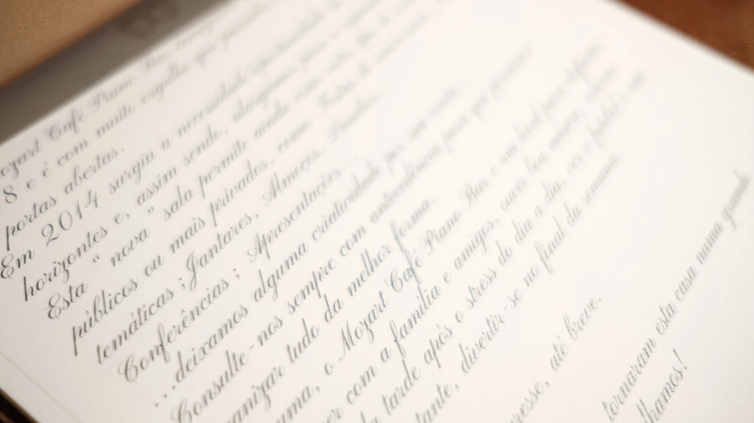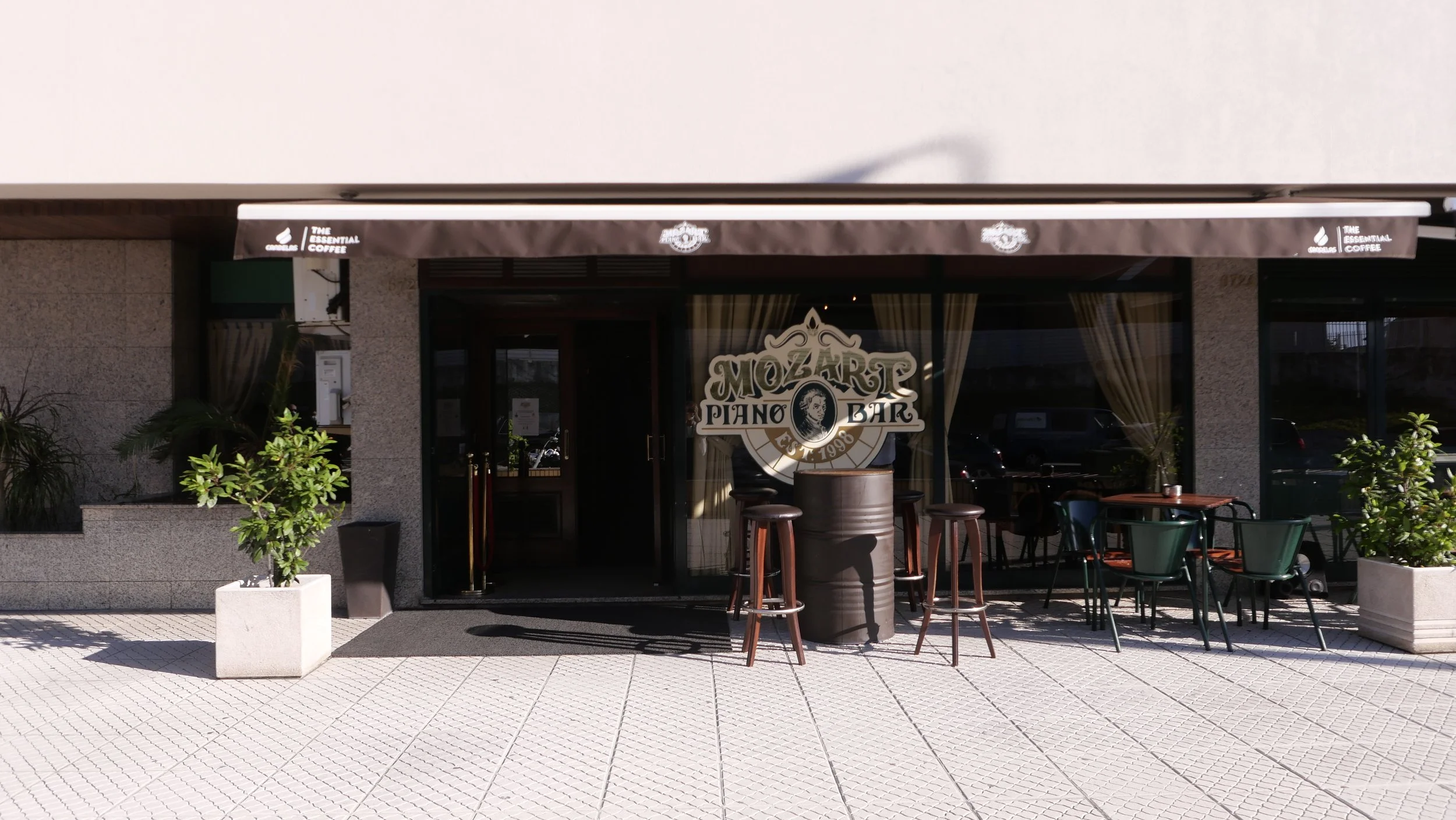 A identidade visual foi cuidadosamente trabalhada para refletir esse espírito, com um logotipo desenhado à mão que incorpora a figura de Mozart e linhas inspiradas nas teclas de um piano. A montra, pintada à mão com folha de ouro de 23kt, acrescenta um toque vintage e elegante, reforçando o caráter intemporal deste espaço único.